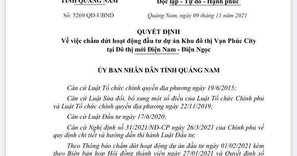 TTO - Tỉnh Quảng Nam vừa chấm dứt hoạt động đầu tư dự án khu đô thị Vạn Phúc City tại đô thị mới Điện Nam - Điện Ngọc.
