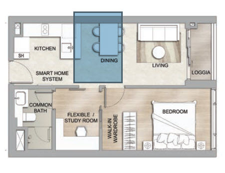 Căn hộ 51 m2 (46 m2 thông thủy) được bố trí gồm: phòng khách, bàn ăn nối liền không gian bếp, 1 phòng ngủ, nhà vệ sinh.