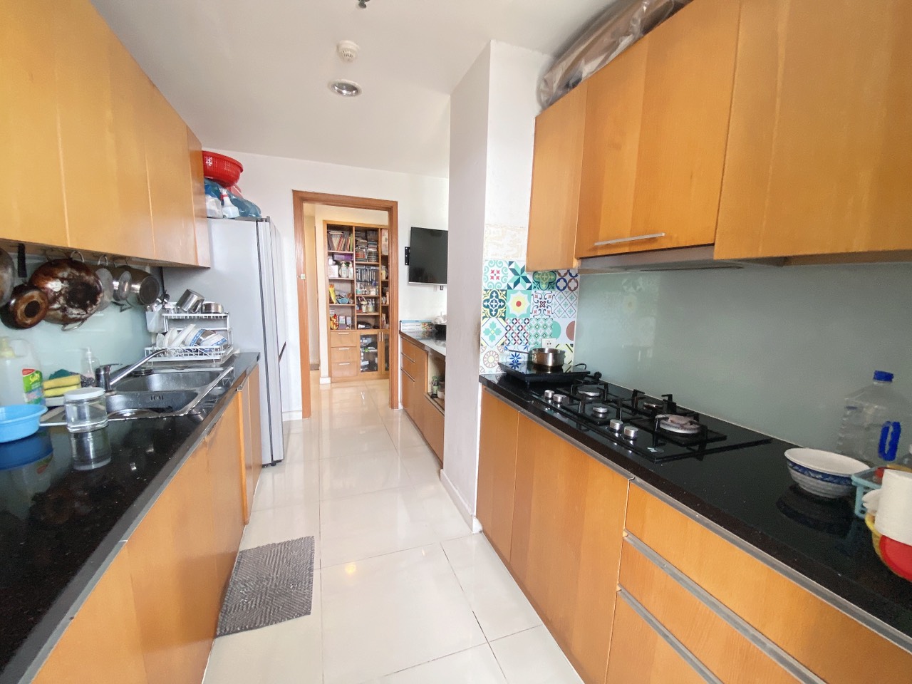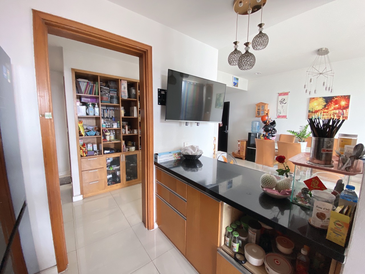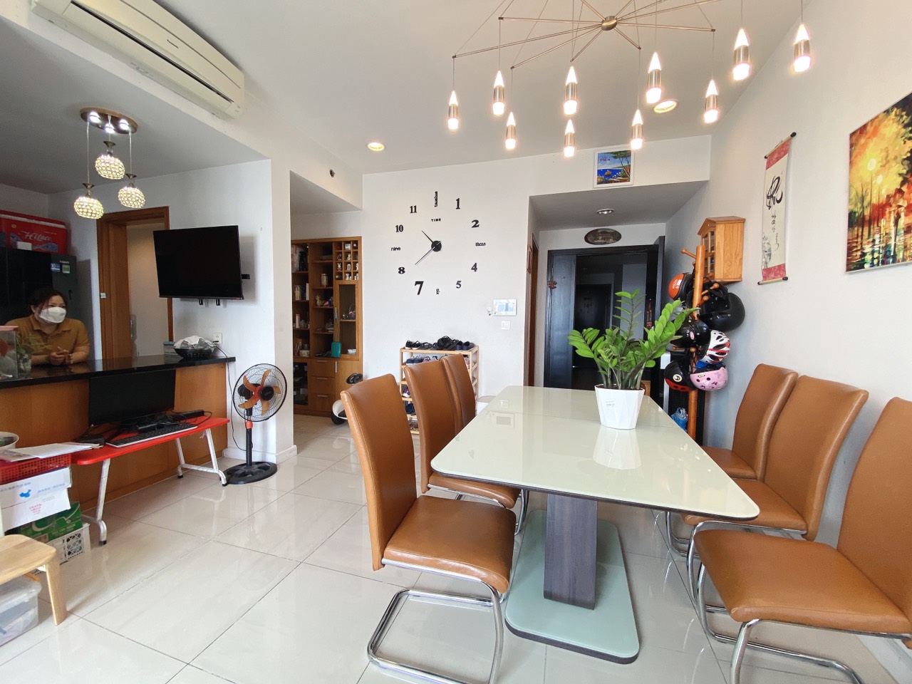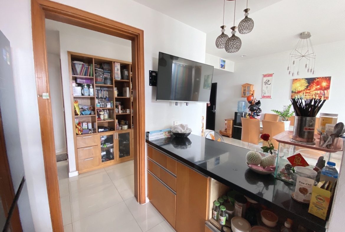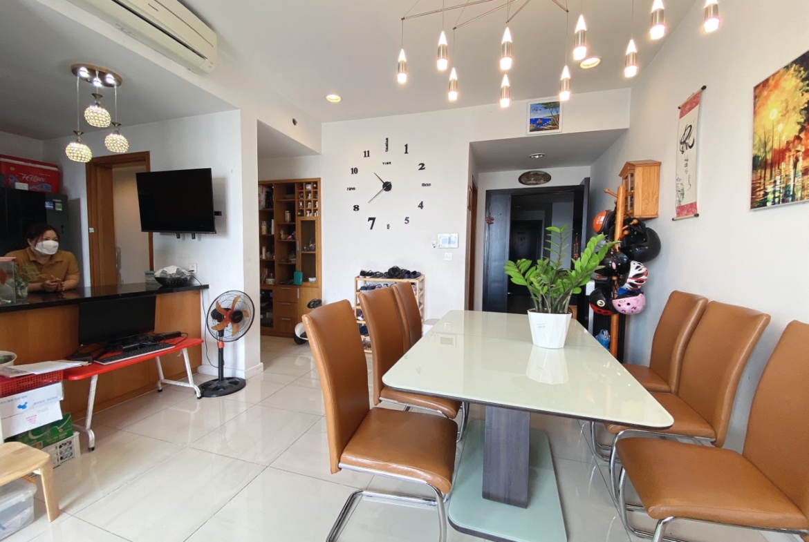 Diện tích 105 m2 được thiết kế gồm phòng khách, phòng ăn, không gian bếp nấu, 2PN, 2WC. Trang thiết bị nội thất cao cấp đầy đủ như sofa da bò nhập khẩu, bàn ăn ghế da + mặt bàn đá tự nhiên, khu vực bếp rộng rãi với bếp, tủ bếp trên dưới, và quầy đảo. Phòng ngủ với giường nệm, tủ âm tường, bàn trang điểm