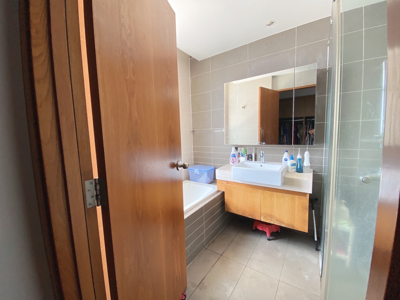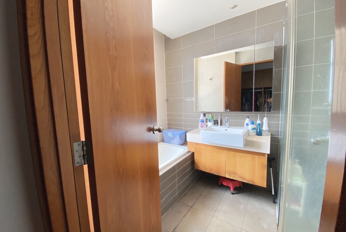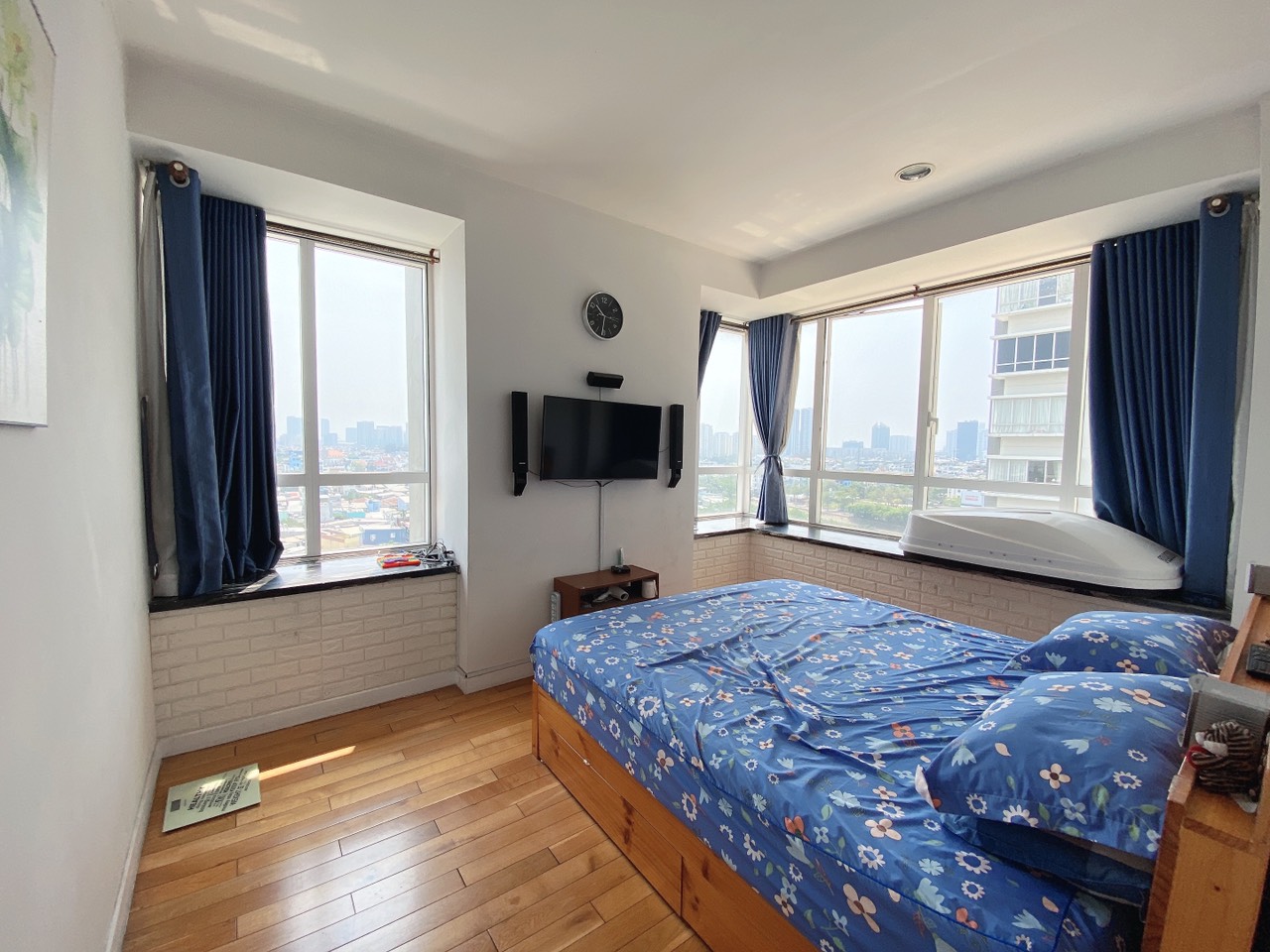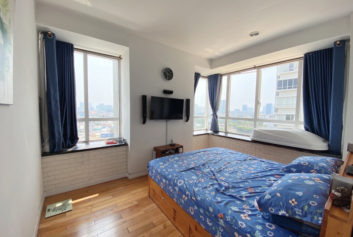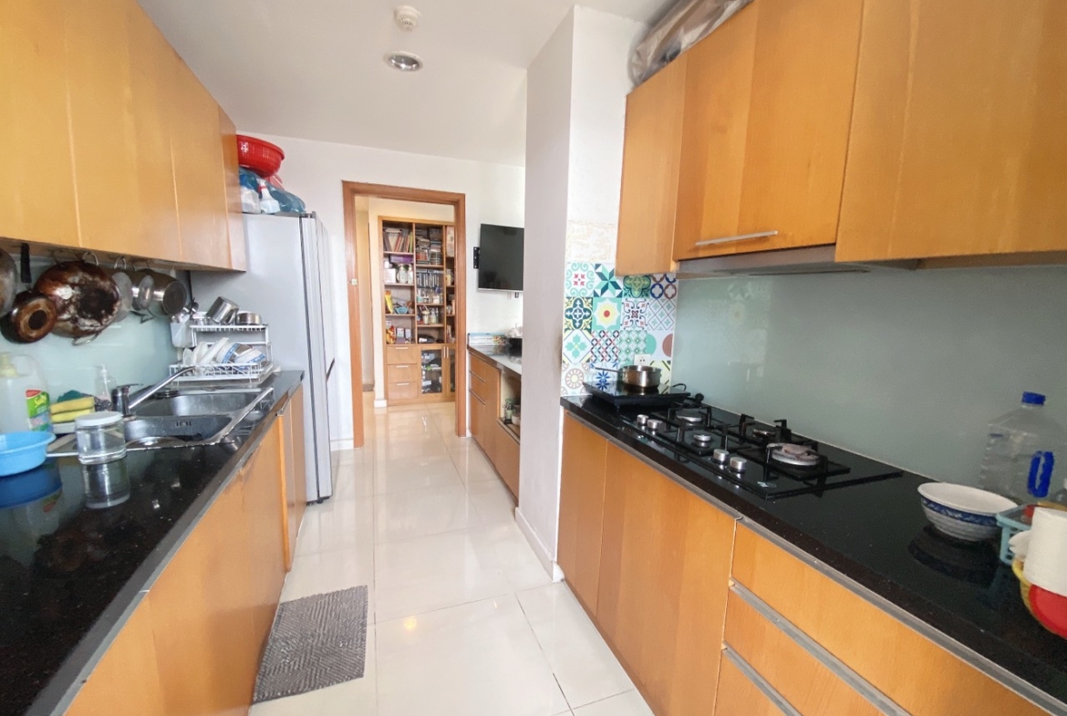 Diện tích 105 m2 được thiết kế gồm phòng khách, phòng ăn, không gian bếp nấu, 2PN, 2WC. Trang thiết bị nội thất cao cấp đầy đủ như sofa da bò nhập khẩu, bàn ăn ghế da + mặt bàn đá tự nhiên, khu vực bếp rộng rãi với bếp, tủ bếp trên dưới, và quầy đảo. Phòng ngủ với giường nệm, tủ âm tường, bàn trang điểm