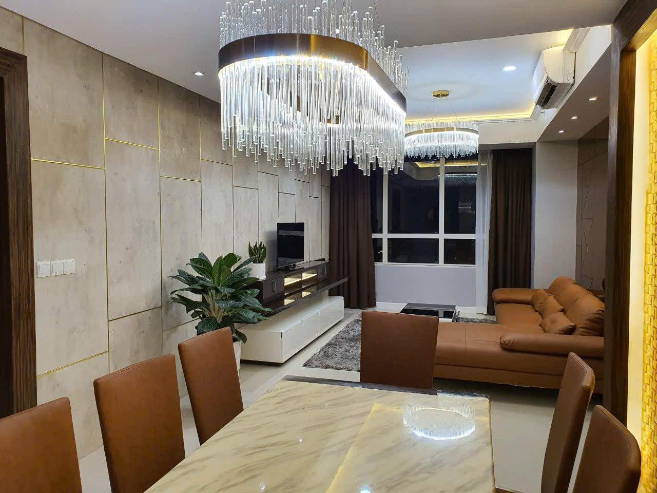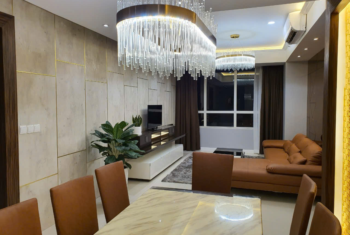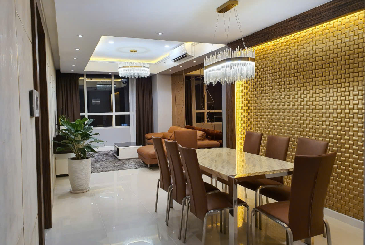 Cho thuê căn hộ Sunrise City 3 phòng ngủ đầy đủ nội thất 130 m2, căn hộ với thiết kế nội thất hiện đại với tường kính, sofa sa bò, đèn chùm trang trí tại phòng khách, khu vực bếp với tủ bếp trên dưới bếp nấu, máy hút mùi, lò nướng, liền kề là khu giặt phơi, 3 phòng ngủ đã có sẵn giường nêm, tủ quần áo, bàn trang điểm