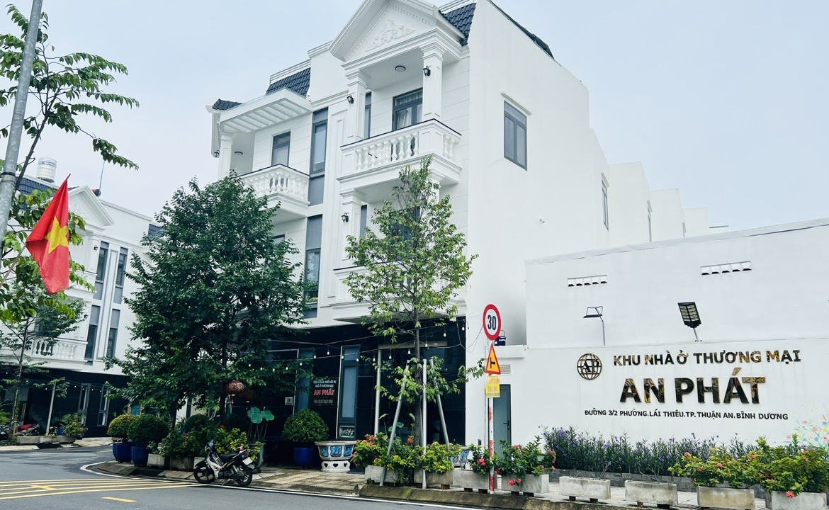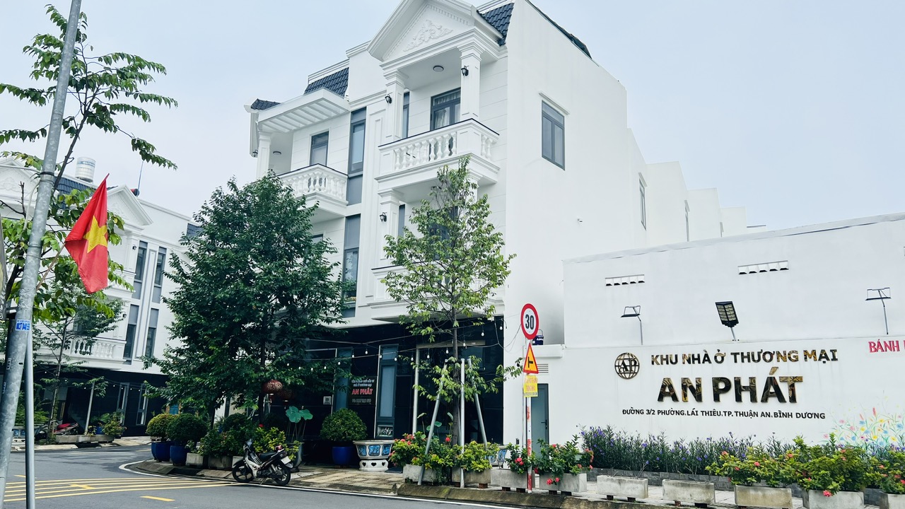 Cho thuê nhà nguyên căn góc 2 mặt tiền đường 3 tháng 2 và đường D1 KDC An Phát Lái Thiêu. Nhà cho thuê có kết cấu gồm trệt 2 lầu, 1 tum và sân thượng, được bố trí gồm tầng trệt thông suốt tiện bố trí làm văn phòng công ty, hoặc phòng trưng bày sản phẩm. Lầu 1: phòng làm việc, bếp, bàn ăn, lầu 2: 2 phòng ngủ. Toàn bộ căn nhà đã hoàn thiện nội thất cao cấp, vào sử dụng ngay