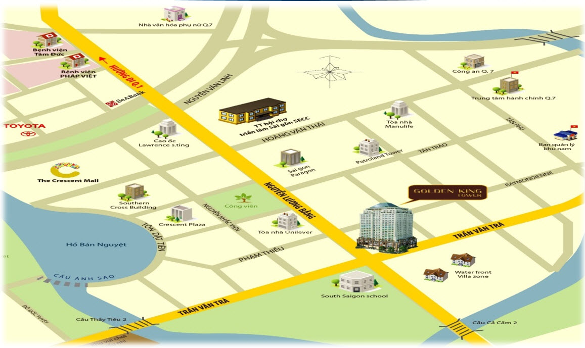 2. Tiện ích xung quanh (Tiện ích ngoại khu) Nhờ nằm trong lòng Khu đô thị Phú Mỹ Hưng, The Golden King thừa hưởng hệ thống tiện ích xung quanh rất đồng bộ và hiện đại, chỉ cách vài phút di chuyển: